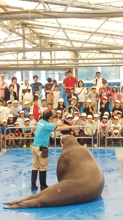 セイウチショーが始まりました。愛くるしいセイウチのポウちゃんが、ものまねをしたり、ポーズをとったり、芸を披露しました❗️