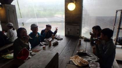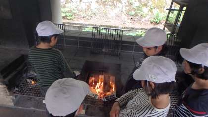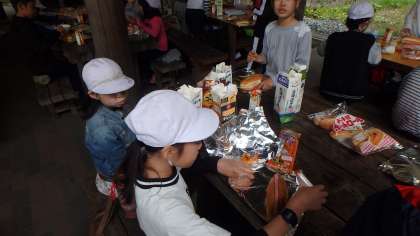 朝食は食堂ではなく,野外炊事場でパックドックをいただきます」。パンにカレー風味のキャベツとウインナーをはさんで,アルミ箔で包み,牛乳パックに入れて焼くだけです。牛乳パックが燃え尽きると外はカリッと中はふんわり,いい感じにできあがっているから不思議です。発明した人はすごいなぁと感心するのも束の間に,できたてホクホクホットドックにかぶりつく子どもたち♪さあ,お腹も満たされたところで,次はおがま池で魚つかみです。うまく捕まえることができるのでしょうか?
