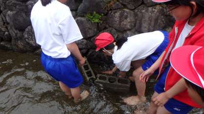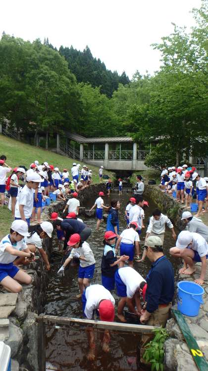 子どもたちも作戦を考えます。岩場へ追い込んだり,複数名で取り囲んだり…みんなで協力して挑んだ結果,1匹残らずすべての魚を捕まえることができました。捕まえたイワナは氷でしめます。