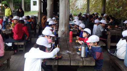 この後は,2つのグループに分かれて活動します。花背焼きをつくるグループと冒険の森でアスレチックを行うグループです。どんな様子かは,また後ほどリポートします。楽しみにお待ちください!
