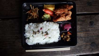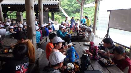 焼き魚の余韻が残るまま野外炊事場で昼食です。今日は,からあげ弁当でした。これも命をいただいているのだな…と感慨深げな子どもたちもいました。エネルギーを補給して午後からの活動に備えます。