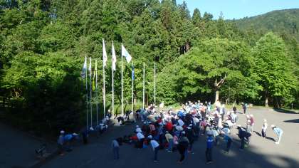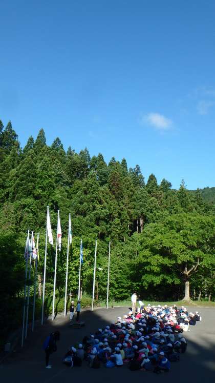 おはようございます。山の家4日目の朝を迎えました。清々しい青空が広がるいい天気です。子どもたちはみんな元気です。朝から寝具をたたみ,荷物の整理をしてロッジを後にしました。朝の集いでは,バブリーなミュージックに合わせて体操しました。最終日も元気にスタートです!
