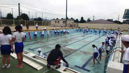金曜日は雨のため延期となっていたプール清掃,今日もあやしい天気で中断もありましたが,6年生が役割分担して1年分の汚れを一掃してくれました♪