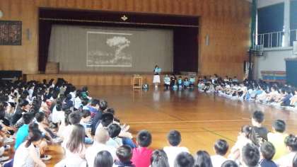 児童集会がありました。まずは,6年生による絵本の読み聞かせです。「8月6日」広島に原子爆弾が落とされたお話です。6年生は7月1日・2日に修学旅行へ出かけます。広島の平和記念公園も訪れます。その際に,捧げる千羽鶴をみんなで折ろうということになりました。6年生を中心に,みんなで平和への願いをこめて鶴を折りました。