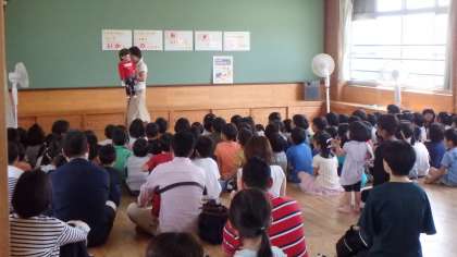 1年生は警察本部の方々に,防犯教室を行っていただきました。華麗なけんちゃんの腹話術からスタートし,「いかのおすし」などの安全の合言葉についてお話しいただきました。