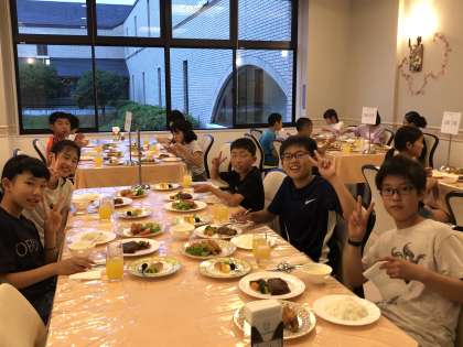 レストランで夕食をいただきました。もうお腹はペコペコ。並べられた豪華なメニューに,いただきますが待ちきれない様子!ごちそうさまでした♪