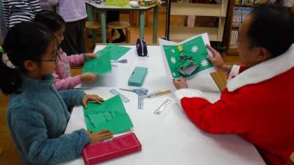 さて今日は,学校司書や図書館ボランティアさんによる読み聞かせとクリスマスカードや飾りづくりが行われていました。ポップアップカードに思い思いのデコレーション♪子どもたちのユニークな発想が飛び出します!素敵なクリスマスプレゼントができましたね☆