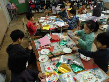 紙皿やガムテープの芯を使って,コロコロしたりゆらゆらしたりするおもちゃ作りに取り組んでいます。実際に遊びながらイメージを膨らませて,楽しみながら工作しました。完成した作品は来週の図工展で展示する予定です。是非ご覧ください。