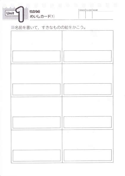 めいしカードには,8こ かく所がありますので,それぞれのカードに,自分の名前と自分のすきなものの絵を8こ かいてください。絵には,色もぬってくださいね。