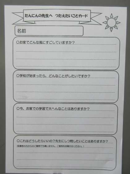 今回,ポストインしたふうとうの中に,「たんにんの先生へ つたえたいことカード」というプリントを入れています。