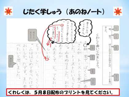 今日,みなさんのお家にふうとうがとどいていると思います。その中に,時間わりが入っています。さんこうにしながら,1日や1しゅうかんのけいかくを立てて,すごしてみてください。