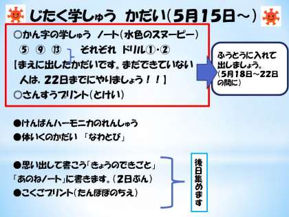 ※学年だよりの「自宅学習課題」の欄には,【●こくごプリント「たんぽぽのちえ」】が書かれていませんが,15日配布の封筒には,「たんぽぽのちえ」のプリントが入っています。後日集めますので,プリントの例を参考にしながら学習を進めてください。