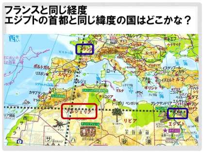 北半球にあり,フランスと同じ経度にある。エジプトの首都と同じ緯度にある国。