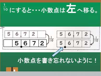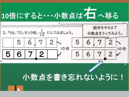 10倍、100倍、1000倍すると,小数点は1けたずつ右へ移りますね。小数点を打ち忘れていた人がたくさんいまいた。
