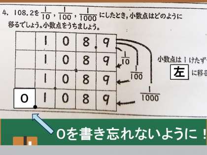 10分の1,100分の1,1000分の1にしたとき,小数点は1けたずつ左へ移ります。特に,108.2を1000分の1にしたとき,0を忘れている人がいました。0.1089になります。解答と一緒に返しますので,間違えたり分からなかったりした問題を見直してください。