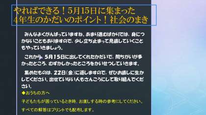社会です。漢字のことや,土地の高さなど難しいことが多かったようです。プリントの色が出てなかったところは,もう一度一緒にやりましょう。