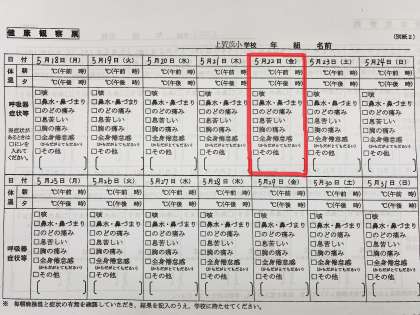 朝に検温して,健康観察票に書いて持ってきてくださいね。