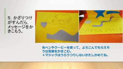 もらった相手によろんでもらえそうな言葉や絵などを考えてかきます。