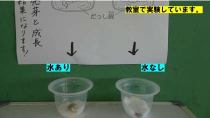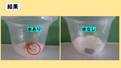 この実験では,調べたい事(今回は水)以外は同じ条件にしなくてはいけません。「水」以外に発芽に必要なものを調べる実験は,学校でしましょう。お楽しみに!