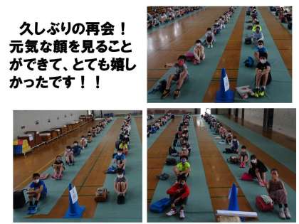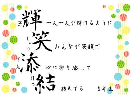 いよいよ学校が再開しました。30分という短い時間でしたが,みんなの元気な顔を見ることができてとても嬉しかったです。しばらくの間,学年そろって集まる機会をもつことがなかなかできません。せっかくの機会だったので,今日はみんなで学年目標『輝笑添結(きしょうてんけつ)』を確認しました。高学年として頑張っていきましょう。
