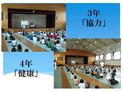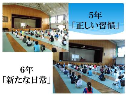 いよいよ本日より学校生活が再開されました。久々に会う友達に嬉しさやちょっとした恥ずかしさが入り混じった笑顔がたくさん見られました。登校後は学年ごとに体育館で校長先生のお話を聞きました。1年生は「とうこう」2年生は「友だち」3年生は「協力」4年生は「健康」5年生は「正しい習慣」6年生は「新たな日常」とそれぞれテーマに沿ってお話をしてもらいました。その後,学年の先生から,これからのこと,特に明日からのことについて説明がありました。