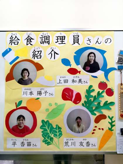 給食室のサービスホールには,みんなにおいしい給食を作ってくれる調理員さんの「紹介」を掲示しています。はやく「お名前」と「お顔」をおぼえて,元気なあいさつができると良いですね。