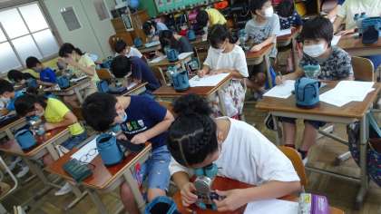 理科「生命のつながり(2)」の学習でメダカを育てています。毎日餌やりや様子を観察し,楽しくお世話をしています。今回の学習では,一人一台ずつ双眼実体顕微鏡を使って,メダカのたまごを観察しました。「目が見えた!」「何か赤いものが見える!」と口々に言いながら記録していました。たまごからメダカの赤ちゃんが生まれるのが楽しみですね。
