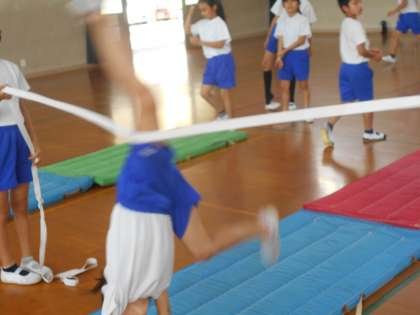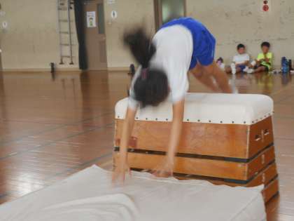 前回に続いてマット運動です。「とび前転」「前方ブリッジ」「ロンダード」「ネックスプリング」(首跳ね起き)などの難しい技に挑戦する子が増えています。