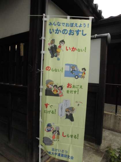 北警察署より防犯を呼びかけるのぼりをいただきました。正門に掲げています。危険な目に遭いそうになったり,遭ってしまったりしたら,「いかのおすし」(いかない)(のらない)(おおごえをだす)(すぐにげる)(しらせる)を意識して行動できるようにしましょう。