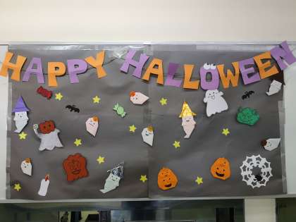 いよいよ10月ということで,朝からこっそり給食室を模様替えしました。