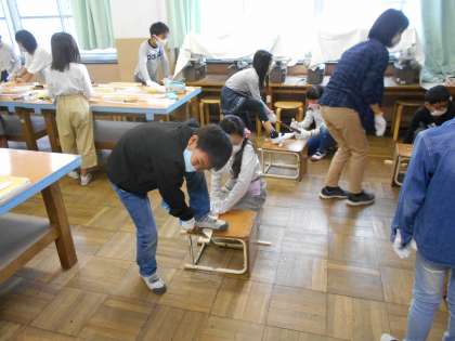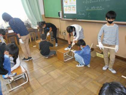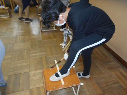 図工では,のこぎりの使い方を学習しています。最初はなかなかうまく切れずに悪戦苦闘でしたが,今ではペアで協力しながら使いこなしています。切った木材をつないで,写真立てのようなものを作ります。