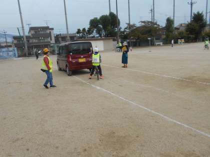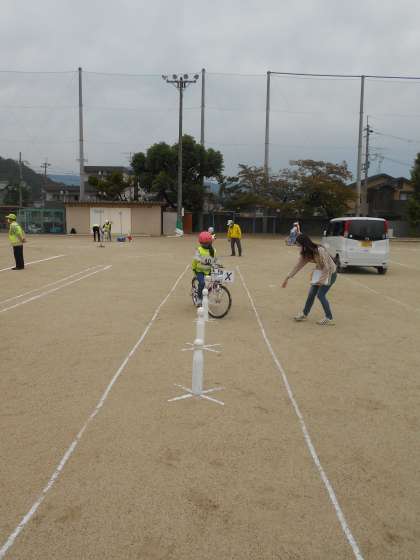 朝早くから,グラウンドにコースをかいていただき,ふだんと同じような感覚で運転できました。でもテストでは「緊張した〜。」という児童が多かったです。たくさんの自転車やヘルメットをお貸しいただきありがとうございました。