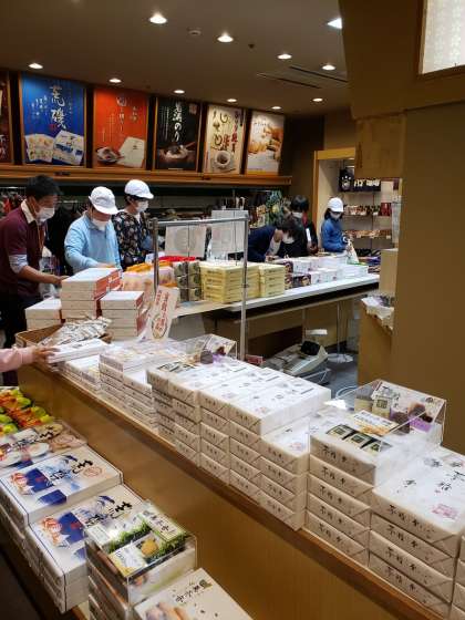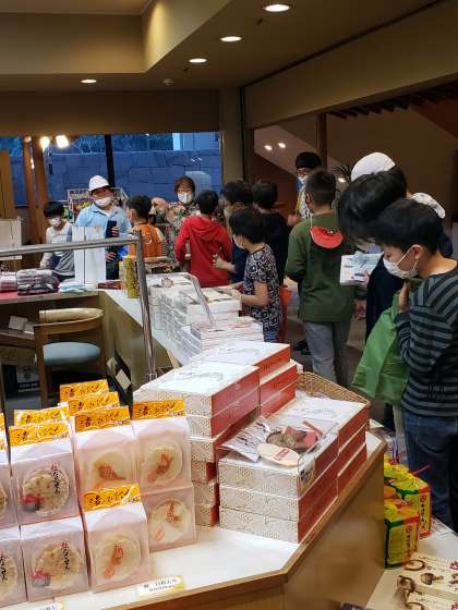 修学旅行のお楽しみの一つである買物タイムです。おいしそうなものはあるかな,家族にはどんなものを買おうかな,とそれぞれに思いを巡らせ買物を楽しんでいます。どんなお土産を買って帰るのか,どうぞお楽しみに。