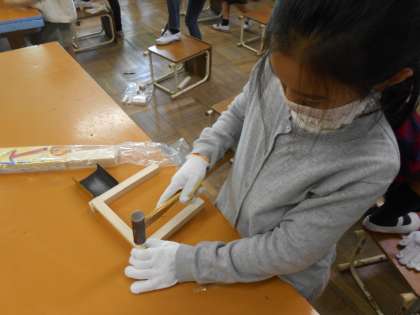 今日はのこぎりだけでなく,金づちでも使いました。3年生の時に学習しているので,どんどん積極的に金づちを使って釘を打っていました。