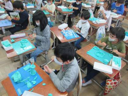 図画工作科の「ねん土でマイタウン」の学習では,自分ですきな町をねん土で作りました。