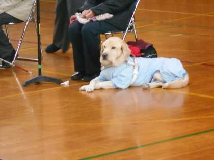 とても落ち着いてそばに佇み,指示に忠実に動く姿を見せてくれましたが,盲導犬だからといって,オールマイティで何でもできるわけではないので,勘違いせず,自分には何ができるかを考え,実行してもらいたいというお話を伺いました。