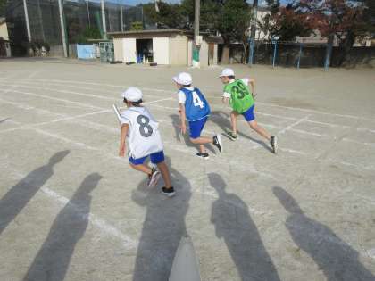 体育の「リレー」の学習では,子どもたちは,一生けんめい走っています。