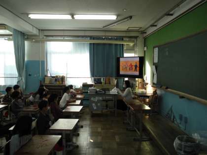朝会ということもあり,子ども達は慣れた様子でテレビ画面を見ていました。校長先生からは,一人一人が安心して,幸せに自分らしく生きるためにどんなことを意識すればいいのかということについてお話いただきました。また「ありがとう」という言葉の大切さについても改めて考えました。その後は各教室で,絵本の読み聞かせや先生のお話を通して人権について話し合いました。