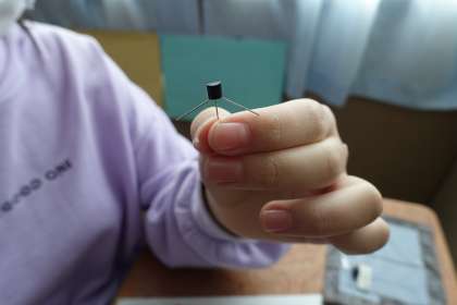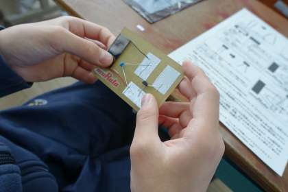 京都のモノづくりのすごいところを聞いた後,いよいよモノづくり体験です。今回ご協力いただいた京都の企業は電子基板や電子部品で有名な〈村田製作所〉です!