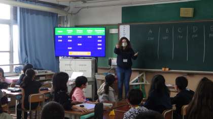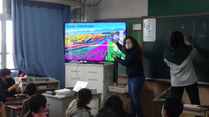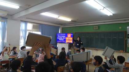 今日はALTの先生と一緒に,5年生,6年生が英語の学習です。今年度一回目ということでクイズ大会が行われ,楽しいひと時を過ごしました。