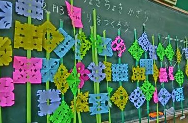 図画工作の時間にはさみの使い方を学習しました。折り紙を折ってはさみで切り,開けるとすてきな模様ができました。教室に飾って,友達の作った飾りの良いところも見つけていて素敵でした。