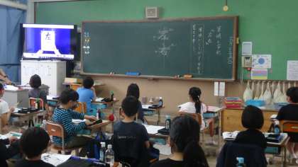 「左右」と書きました。書く前には,どのようなポイントに気を付けたらいいか,また,筆の運びをどうしたらうまく書けるか,しっかりと確認します。集中して習字に取り組んでいるので,なかなかにいい字を書くことができています。