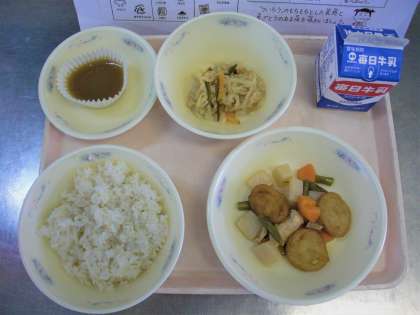 麦ごはん,牛乳,平天とこんにゃくの煮つけ,切干大根の三杯酢
