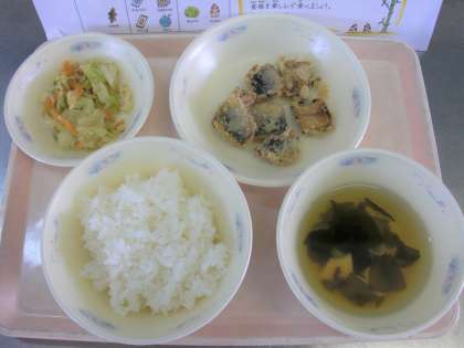 ごはん いわしのこはくあげ キャベツのごま煮 若竹汁です。