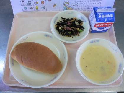 黒糖コッペパン,牛乳,じゃがいものクリームシチュー,ひじきのソテーです。