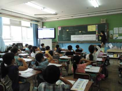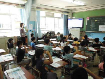 鍵盤ハーモニカでの演奏ができないので,体を使って音の高低をみんなで確かめました。手の位置の上げ下げで,音の高低を表します。体を使っての音楽を楽しんでいる2年生です。