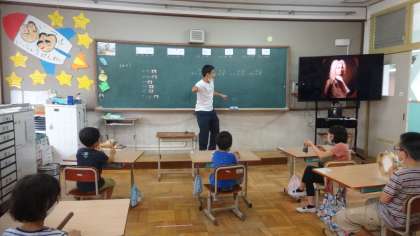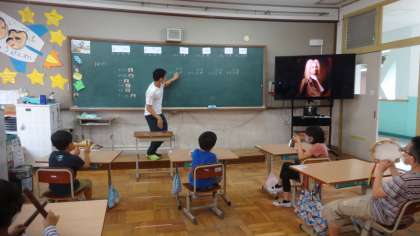 音楽の時間,それぞれに楽器を持ってリズム打ちを楽しみました。伴奏に合わせて,先生にもリズムをとってもらいながら,みんなで楽しみました。