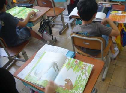 「スイミー」を学習してきた2年生。今日は,自分のお気に入りのレオ・レオニの作品を見つけるために,みんなでレオ・レオニの作品を読みました。