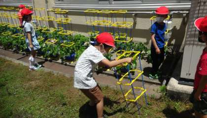 アサガオが瞬く間に大きくなってきたので,植木鉢に支柱を付けました。支柱に絡まりながら,また大きくなっていくアサガオを観察していきます。