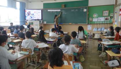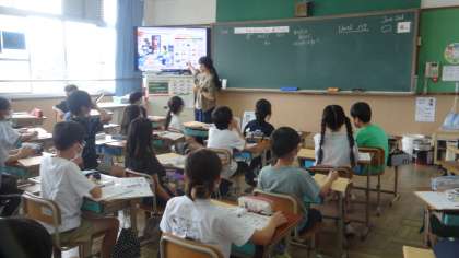 5年生の外国語の学習の時間に教室を訪ねると,「HELLO!」と英語で元気よく挨拶してくれます。外国語の時間を満喫しています。